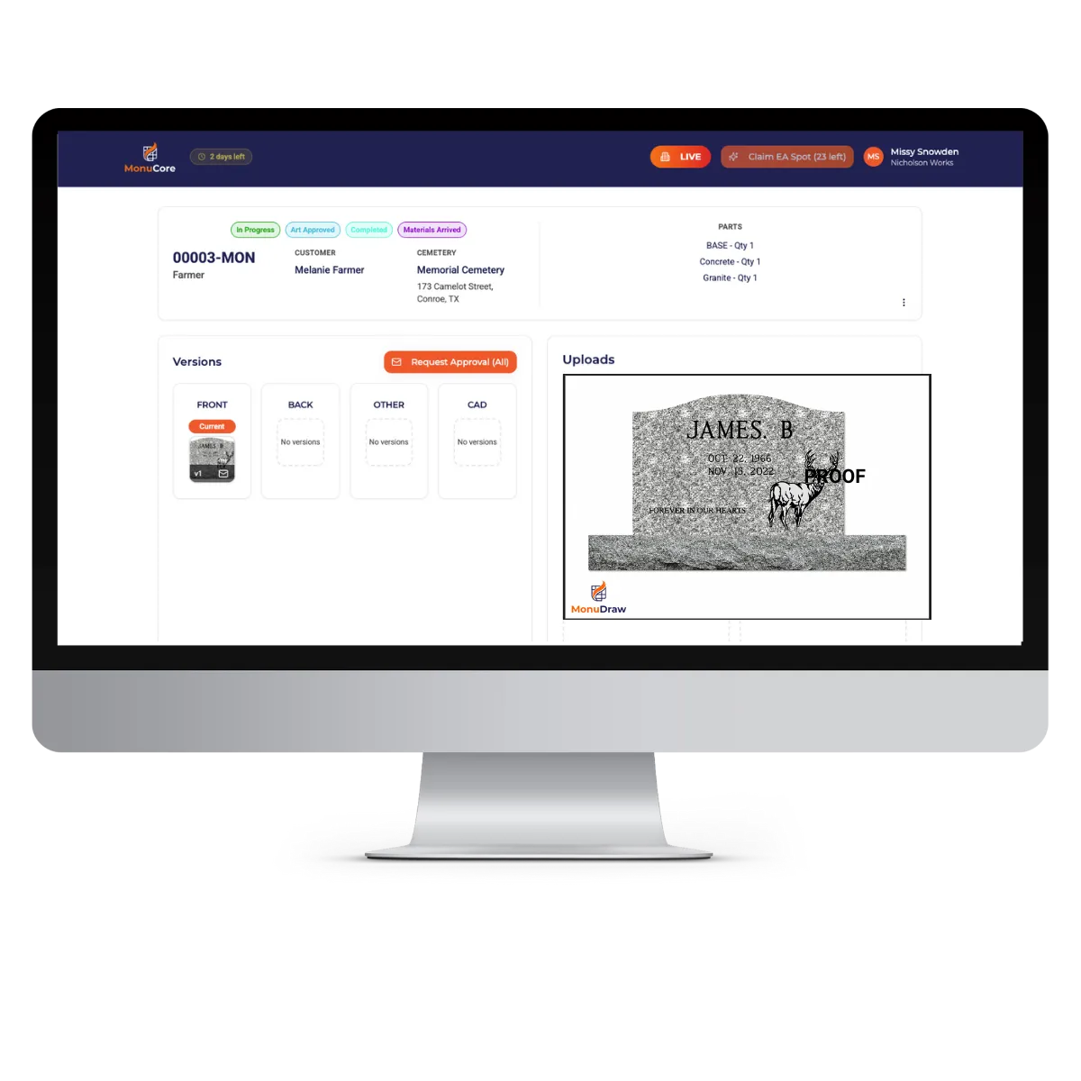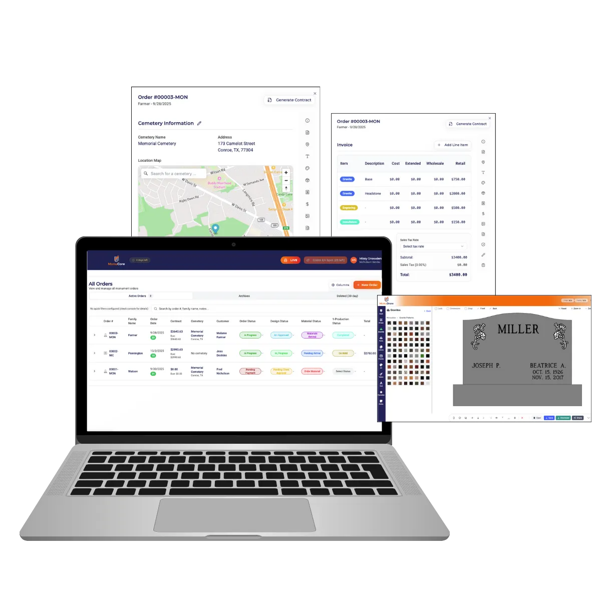 MonuCore is the only all-in-one system built specifically for the monument industry. With three powerful modules working together, you’ll keep every order moving and every family informed.